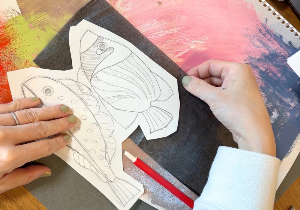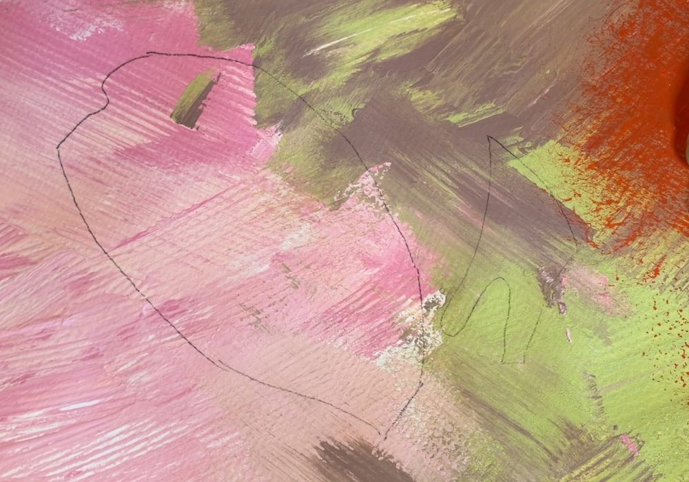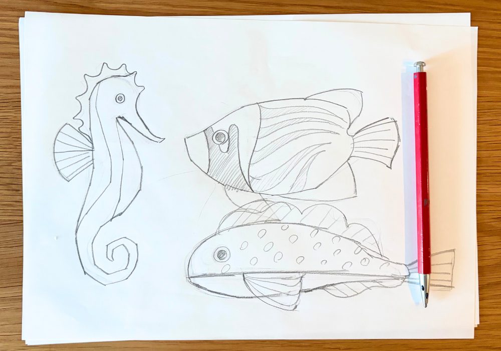 鉛筆でざくざくっと、モチーフを描いていきます。このタイミングで、なんとなく使う色味を考えておきます。