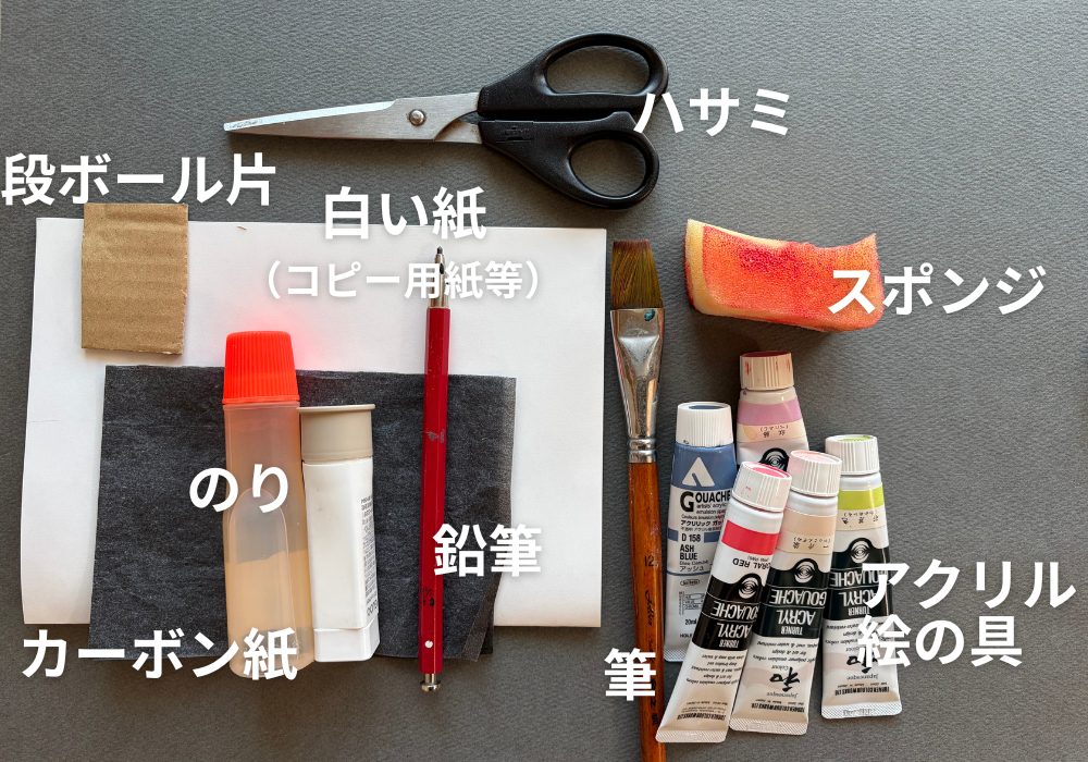 なるほど!家にあるものでなんとかできそう。無いのはカーボン紙とアクリル絵の具くらいかな。